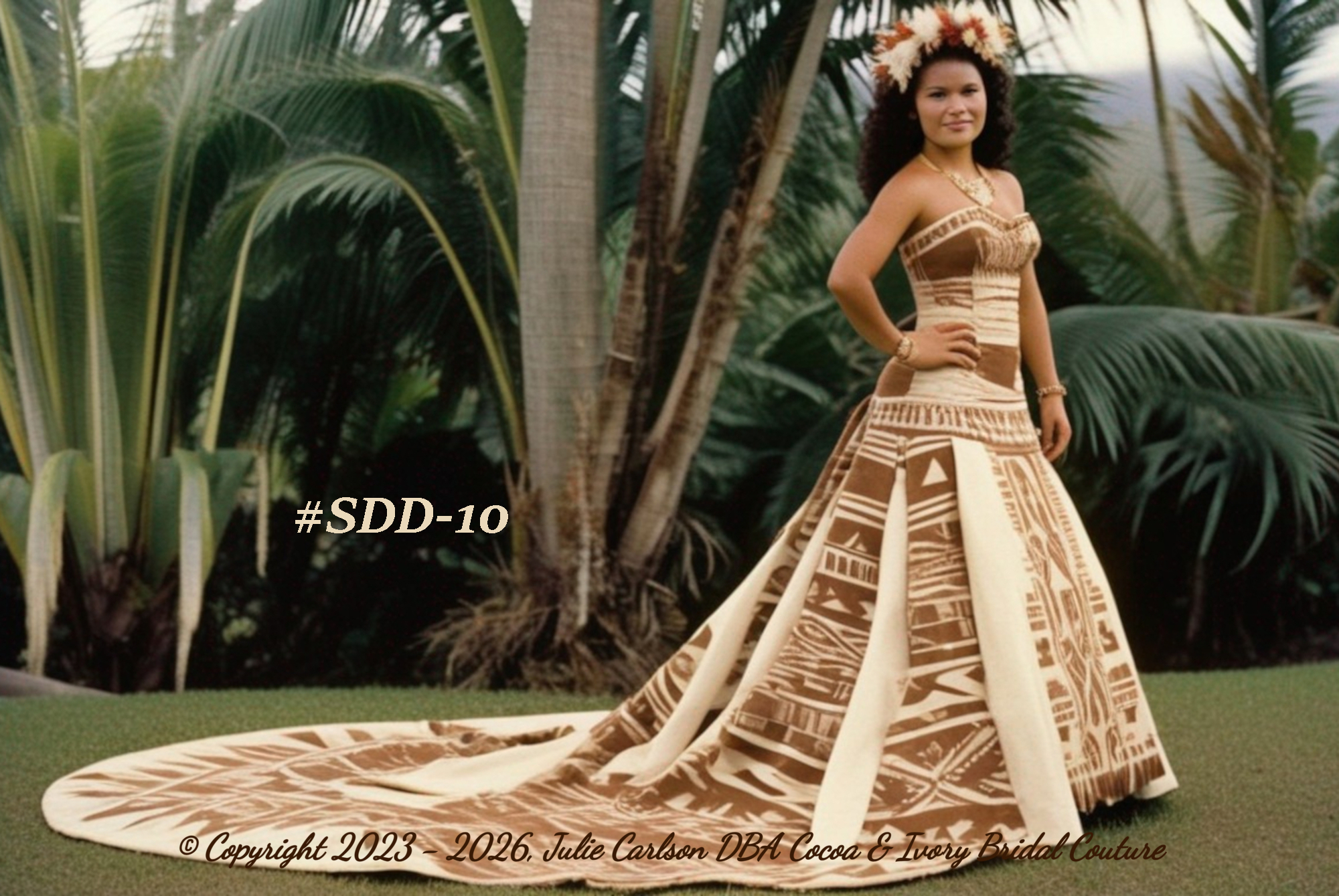 The true magic of this gown lies in its intricate, hand-painted details. Created with a mix of techniques, including wooden block prints, artistic stencils, and free-hand painted designs, each dress is a unique canvas. Delicate, hand-painted patterns in the “Cocoa and Ivory Alternate” color collection gracefully flow over the solid-colored fabric, ensuring no two gowns are exactly alike.